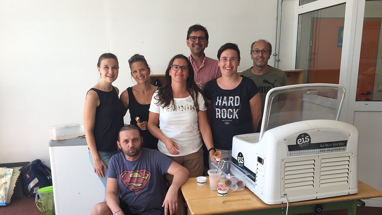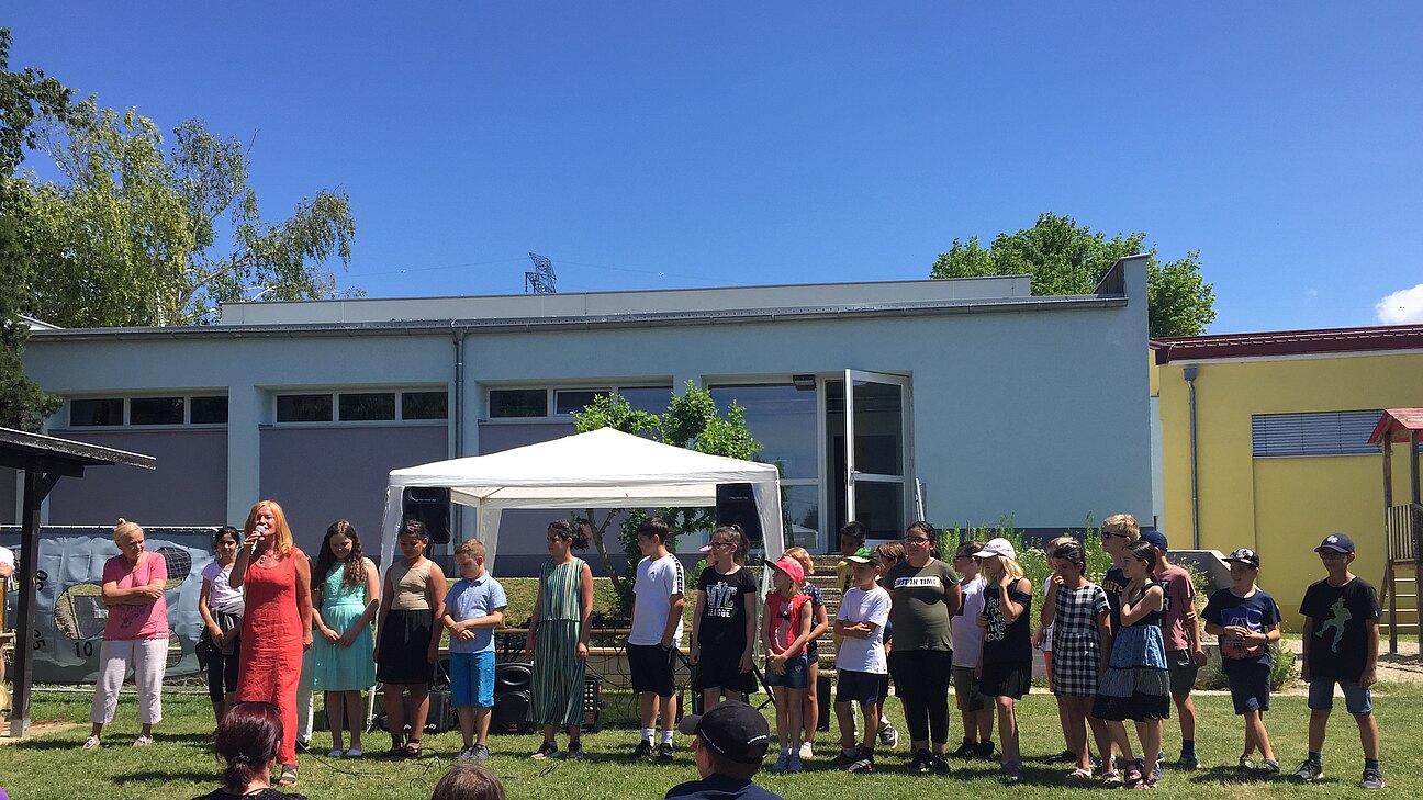 Tänzen, einstudiert mit ihrer Klassenlehrerin Kerstin Langheinrich und einstudierte Lieder mit Unterstützung von Andrea Wiesinger. Der Elternverein verköstigte die Kinder und Eltern mit Kuchenbuffet und Leberkässemmeln. Für gute Stimmung sorgte DJ Patrick mit poppiger Musik. Für eine willkommene Abkühlung sorgte die ÖVP Lanzendorf/Maria Lanzendorf mit Eisgreissler-Eis aus Krumbach.
